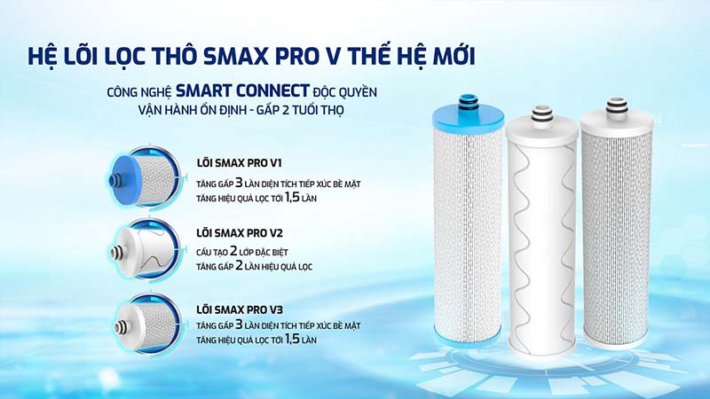 Nâng cấp hệ lõi lọc Smax Pro V độc quyền, tăng gấp 3 lần diện tích tiếp xúc với nước, tăng đến gấp 2 lần hiệu quả lọc. Ứng dụng công nghệ Smart Connect giúp vận hành ổn định, đồng thời nâng cao tuổi thọ lõi lọc gấp 2 lần so với thế hệ lõi lọc thô thế hệ cũ.