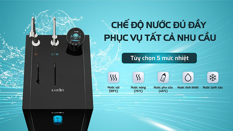| Nhiệt độ nước Nóng (Nhiệt độ nước thực tế sẽ phụ thuộc vào nhiệt độ môi trường và thể tích nước lấy ra): | 45 – 75 – 99 độ |
