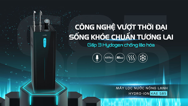 Máy lọc nước nóng lạnh KAE S85 ứng dụng công nghệ Hydro-ion 3in1, sử dụng phương pháp điện phân hiện đại kết hợp với cụm lõi chức năng Smax hiệu suất cao, đem đến giải pháp toàn diện cho nguồn nước, đồng thời nâng cấp mức độ chăm sóc sức khỏe lên một tầm cao mới
