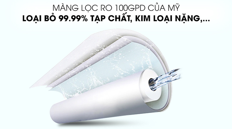– Màng lọc RO 100GDP (Mỹ): Loại bỏ 99,99% clo, dầu, virus, vi khuẩn, amip, asen, các ion kim loại và các chất độc hại trong nước.