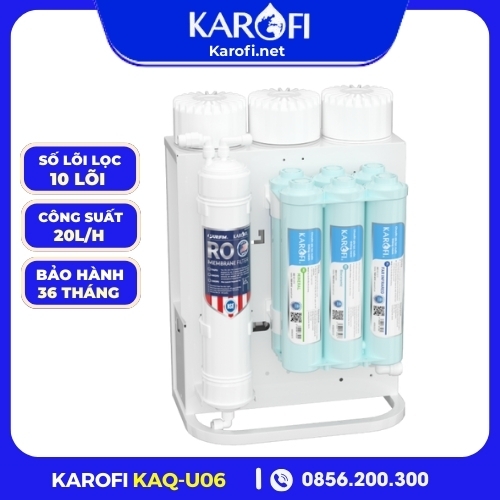 Máy lọc nước RO Karofi KAQ-U06 10 lõi với thiết kế lắp âm nhỏ gọn, công suất lọc đến 20 lít/giờ cùng nhiều tiện ích thông minh như tự động xả nước thải, ngừng hoạt động khi nước đầy bình, trung hoà độ pH ổn định độ ngọt cho nước,... mang lại nguồn nước sạch giúp bảo vệ sức khoẻ của bạn và người thân.