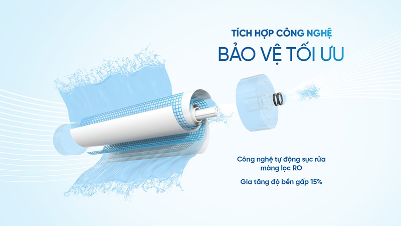 Quá trình tự sục rửa sẽ diễn ra trong 15s đầu tiên trước khi bắt đầu quá trình lọc, giúp kéo dài tuổi thọ và đảm bảo hiệu suất màng lọc RO.