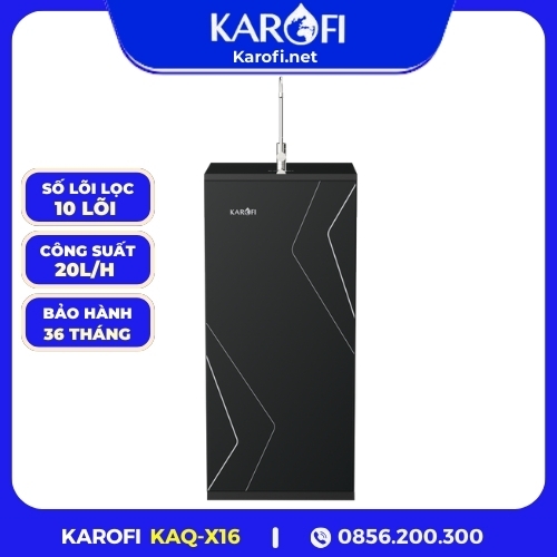 Máy lọc nước RO Karofi KAQ-X16 với 10 lõi lọc, máy được trang bị màng lọc RO 100 GPD sản xuất tại Hàn Quốc đảm bảo chất lượng, thu hồi đến 50% nước tinh khiết cùng nhiều tiện ích như ngừng hoạt động khi áp lực nước thấp, tự động xả nước thải,...