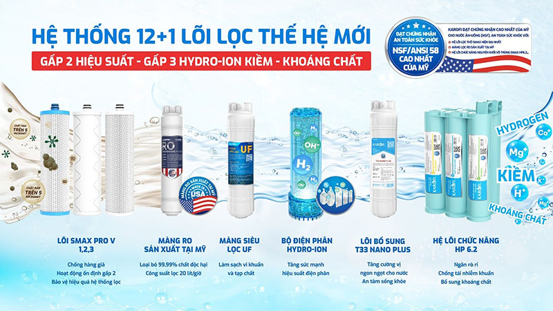 Hệ thống lọc 12+1 lõi Smax độc quyền: cụm lõi lọc thô Smax Pro V, màng RO, lõi điện phân - Hydro-ion - 2 tấm điện cực Titanium mạ Bạch Kim quý hiếm, màng UF, thêm 1 lõi T33 Nano Plus và hệ thống lõi chức năng HP 6.2 |