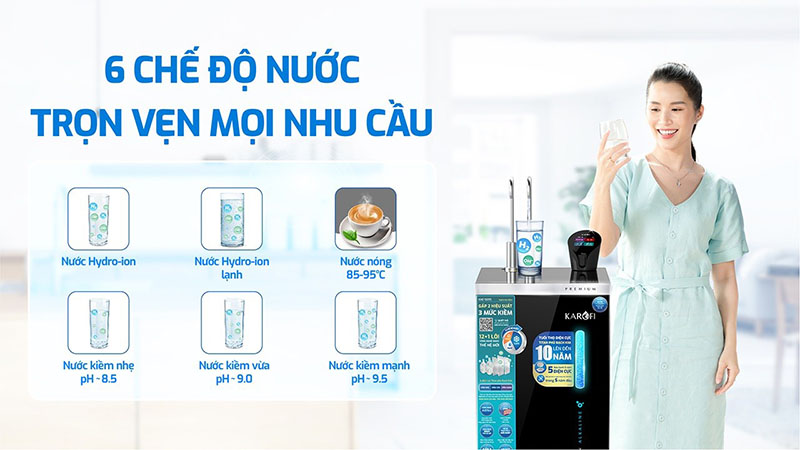Karofi KAE-S695 được trang bị 12+1 lõi lọc, giúp loại bỏ 99,99% vi khuẩn, kim loại nặng và tạp chất, đảm bảo nguồn nước sạch đạt chuẩn tinh khiết.