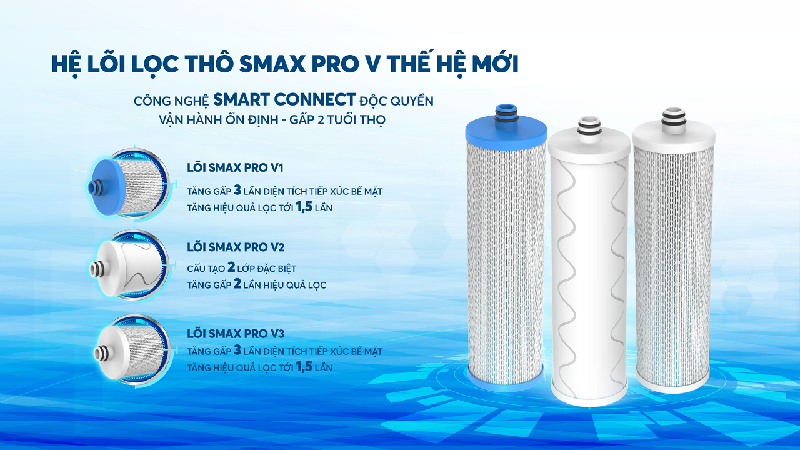 Sử dụng hệ lõi Smax Pro V 1, V 2, V3 giúp tăng gấp 3 lần diện tích tiếp xúc với nước, tăng đến gấp 2 lần hiệu quả lọc. Ứng dụng công nghệ Smart Connect giúp vận hành ổn định, đồng thời nâng cao tuổi thọ lõi lọc gấp 2 lần so với thế hệ lõi lọc thô thế hệ cũ.