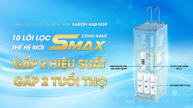 Máy lọc nước nóng lạnh KAD-M59 sở hữu hệ thống 10 lõi lọc công nghệ Smax thế hệ mới giúp gấp đôi hiệu suất, gấp đôi tuổi thọ, bổ sung Hydrogen và khoáng chất có lợi cho cơ thể.