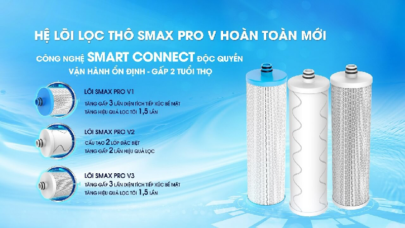 Bộ 3 lõi lọc thô Smax Pro V với công nghệ Smart Connect chống hàng giả hàng nhái, cấu trúc lõi rẻ quạt thông minh tăng gấp 3 lần diện tích tiếp xúc với nước, nâng cao gấp 2 lần hiệu quả lọc và tuổi thọ lên đến 12 tháng.