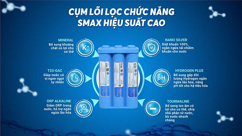 Cụm lõi lọc Smax hiệu suất cao cung cấp nhiều khoáng chất tốt kết hợp thêm lõi Nano Silver Plus giúp gấp đôi khả năng diệt khuẩn đảm bảo chất lượng nước đầu ra tinh khiết nhất.