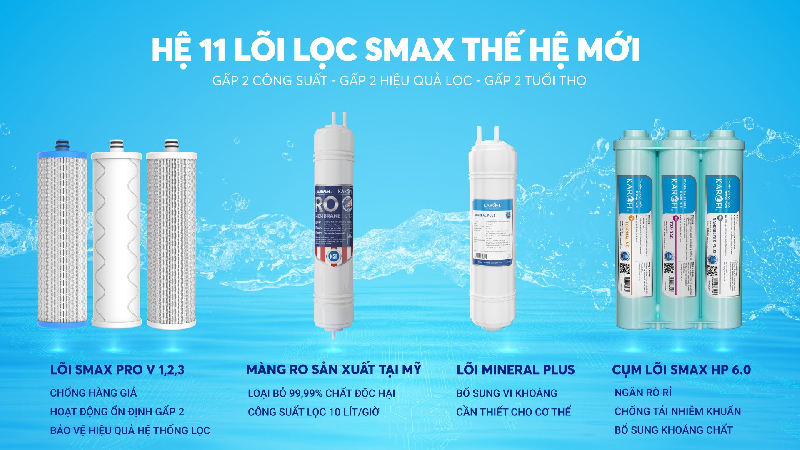Hệ thống lọc | Hệ thống lọc 11 lõi Smax độc quyền: cụm lõi lọc thô Smax Pro V, màng RO, bổ sung thêm 1 lõi Mineral Plus và hệ thống lõi chức năng HP 6.0 |