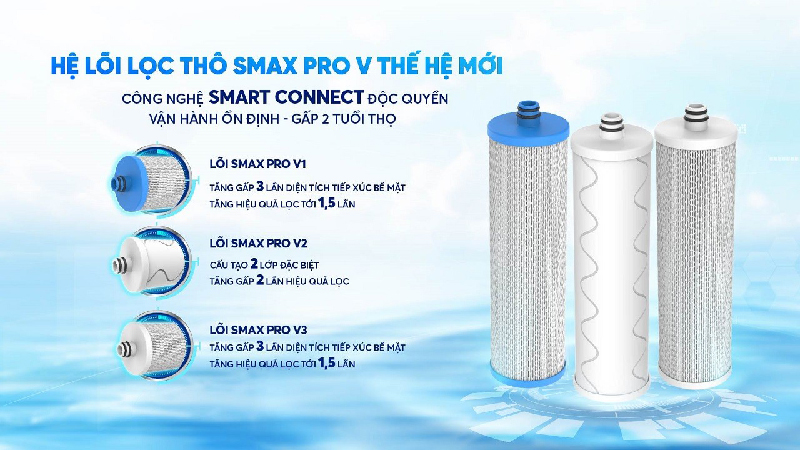 – Bộ 3 lõi lọc thô Smax Pro V với công nghệ smart connect chống hàng giả hàng nhái, cấu trúc lõi rẻ quạt thông minh tăng gấp 3 lần diện tích tiếp xúc với nước, nâng cao gấp 2 lần hiệu quả lọc và tuổi thọ lên đến 12 tháng.