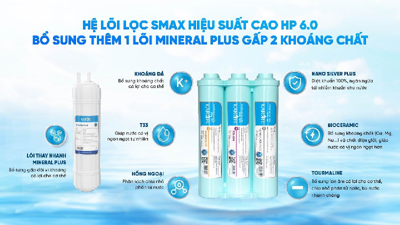 Các lõi chức năng | Thêm 1 lõi Mineral Plus với hệ lõi chức năng Smax hiệu suất cao HP 6.0: Mineral (Khoáng đá); Bioceramic; Far infrared; Tourmaline; T33-GAC; Nano Silver Plus |