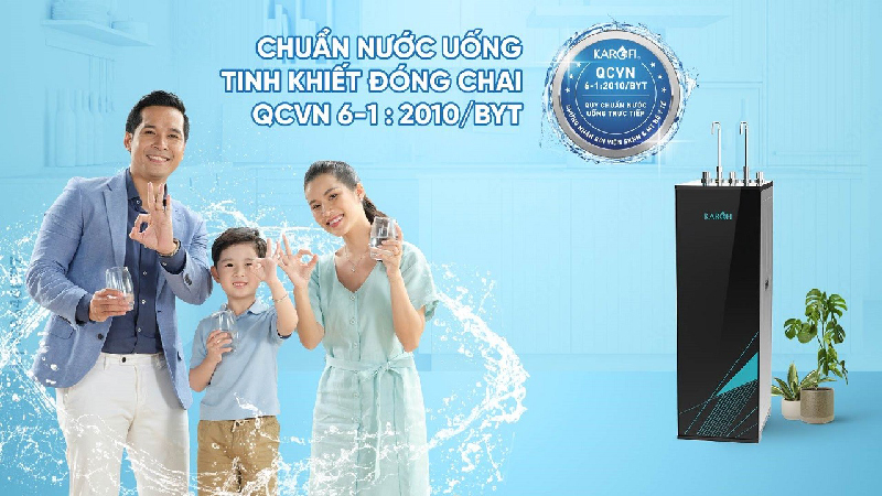 Nguồn nước sau lọc từ máy lọc nước nóng lạnh Karofi KAD-X58 đạt chuẩn nước uống tinh khiết đóng chai QCVN 6-1:2010 BYT do Viện Sức khỏe nghề nghiệp & Môi trường – Bộ Y Tế công nhận.