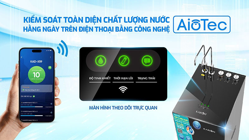 Kết nối với ứng dụng Karofi 365 để kiểm tra độ tinh khiết (TDS), tình trạng lõi lọc, cảnh báo thay lõi.