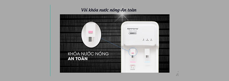 WPK-903 thể hiện rõ sự quan tâm đến người dùng thông qua thiết kế khóa an toàn cho vòi nóng. Không chỉ đảm bảo trẻ nhỏ tránh xa nguy cơ bỏng khi lấy nước, tính năng này còn giúp người lớn tuổi yên tâm hơn khi sử dụng.