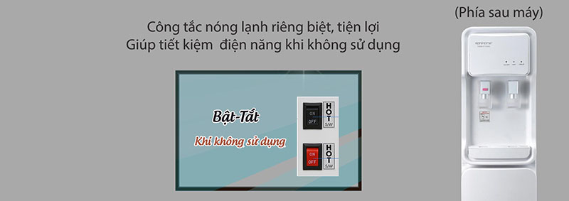 Máy được trang bị công tắc bật/tắt riêng cho từng chế độ nóng và lạnh. Điều này giúp bạn linh hoạt kiểm soát mức tiêu thụ điện năng và chỉ sử dụng khi thực sự cần thiết.