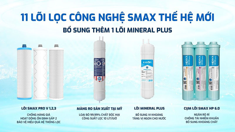 | Hệ thống lọc | Hệ thống lọc 11 lõi Smax độc quyền: cụm lõi lọc thô Smax Pro V, màng RO, thêm 1 lõi Mineral Plus và hệ thống lõi chức năng HP 6.0 (thông báo thay đổi từ tháng 4/2023 sẽ bỏ lõi Mineral Plus) |