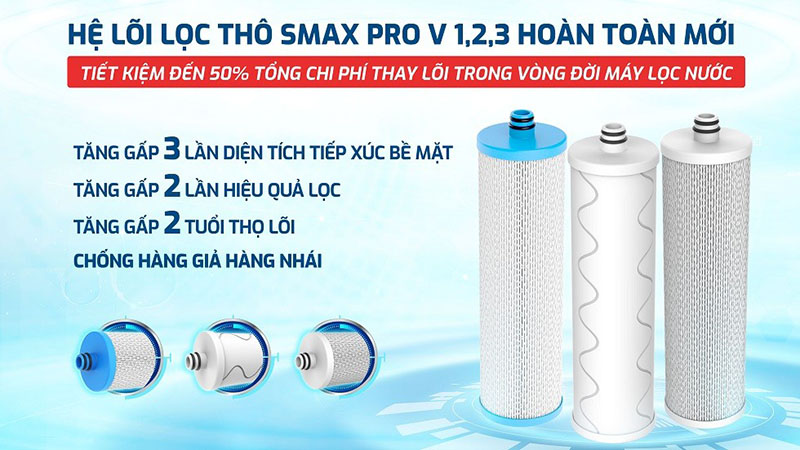 3 lõi lọc thô Smax Pro V - Hệ lõi lọc thô đầu tiên và duy nhất tại Việt Nam có khả năng chống hàng giả, hàng nhái, bảo vệ hiệu quả hệ thống lọc nhờ công nghệ Smart Connect.
