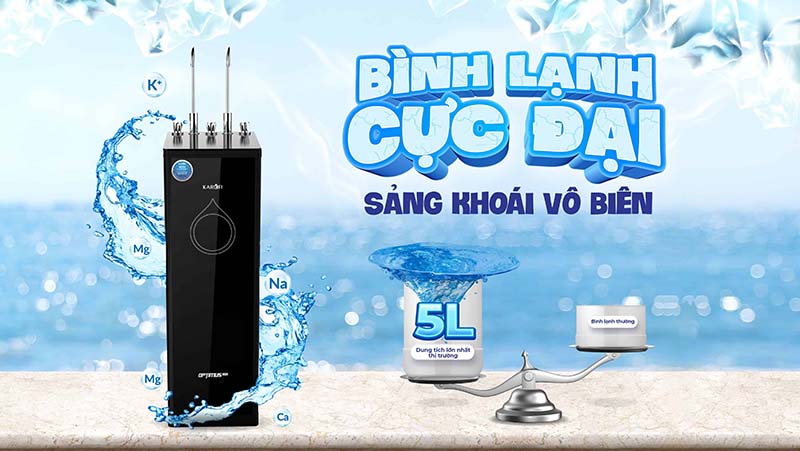 Dung tích bình lạnh đến 5 lít - lớn nhất thị trường đảm bảo cung cấp nguồn nước lạnh liên tục, dồi dào cho cả gia đình đặc biệt trong những ngày thời tiết nắng nóng.