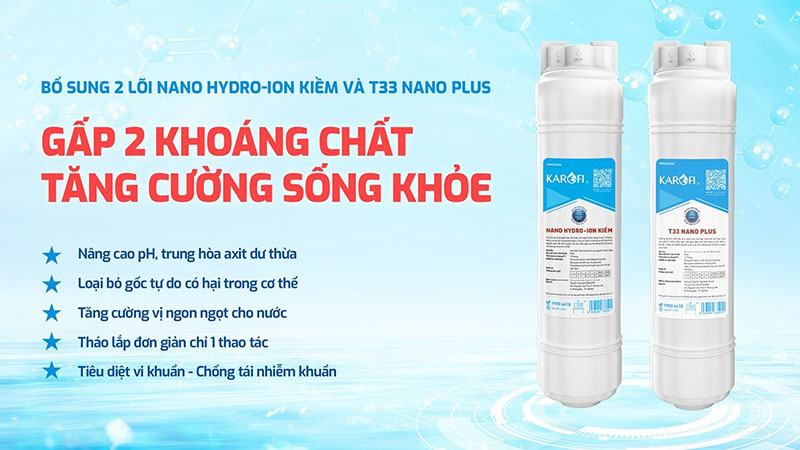 Lõi Nano Hydro-ion kiềm tích hợp 4 chức năng trong 1: bổ sung Hydrogen, Ion kiềm, khoáng chất, hỗ trợ diệt khuẩn – mang lại nguồn nước tốt cho hệ tiêu hóa và hệ miễn dịch.