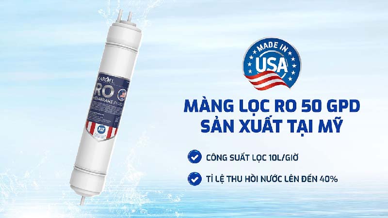 Màng RO 50 GPD nguyên khối sản xuất tại Mỹ lọc sạch đến 99,99% virus, vi khuẩn, ion kim loại nặng và chất độc hại, tạo nguồn nước chuẩn tinh khiết. Công suất lọc lên đến 10 lít/giờ, tỷ lệ thu hồi nước tinh khiết đạt tới 40%.
