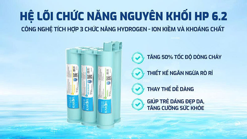 | Các lõi chức năng | HP 6.2: Mineral (Khoáng đá); ORP Alkaline; Hydrogen Plus; Tourmaline; T33-GAC; Nano Silver Plus |