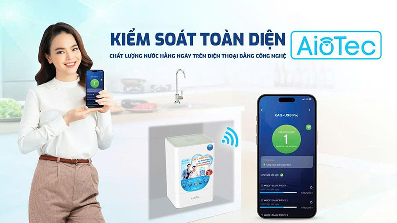 Karofi KAQ-U98 PRO tích hợp công nghệ AioTec giúp quản lý chất lượng nước và tình trạng máy qua smartphone.
