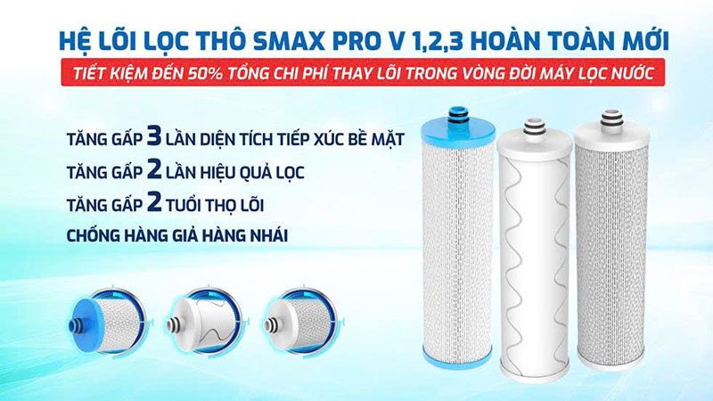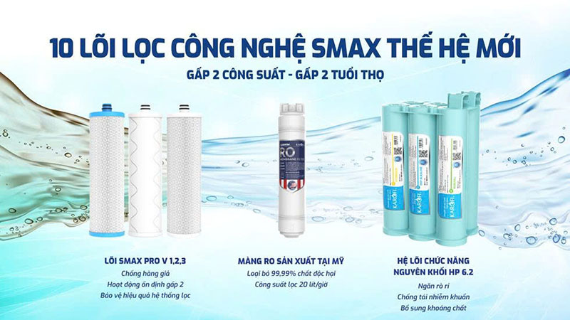 | Hệ thống lọc | Hệ thống lọc 10 lõi Smax độc quyền: cụm lõi lọc thô Smax Pro V; màng RO; hệ lõi chức năng HP 6.2 hiệu suất cao |