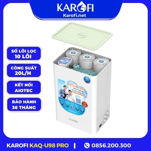 Karofi KAQ-U98 PRO là thế hệ máy lọc nước để gầm thông minh, nâng tầm trải nghiệm người dùng với công nghệ AioTec giám sát từ xa, vòi LED cảnh báo trực quan, hệ thống lọc 10 lõi Smax mạnh mẽ, bổ sung gấp đôi Hydrogen và khoáng chất. Sản phẩm giúp bạn yên tâm tận hưởng nguồn nước tinh khiết đạt chuẩn QCVN 6-1:2010/BYT ngay tại nhà.