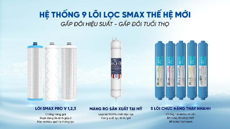 | Hệ thống lọc | Hệ thống lọc 9 lõi Smax độc quyền: cụm lõi lọc thô Smax Pro V; màng RO; 5 lõi chức năng thay nhanh |