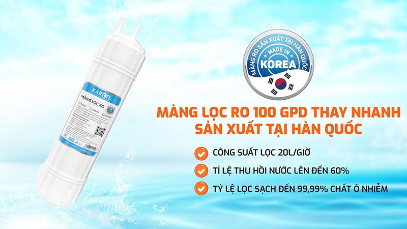 Màng RO 100GPD sản xuất tại Hàn Quốc có khả năng lọc sạch đến 99,99% chất ô nhiễm, ion kim loại nặng... có trong nước, mang lại nguồn nước tinh khiết chuẩn an toàn.