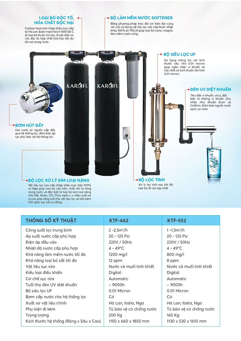 Máy lọc nước tổng đầu nguồn Karofi KTF-662 là thiết bị lọc cao cấp được thiết kế chuyên biệt để xử lý toàn diện nguồn nước sinh hoạt trong gia đình, biệt thự, chung cư, nhà phố... Với hệ thống lọc tiên tiến cùng vật liệu nhập khẩu 100% từ các quốc gia G20 như Hà Lan, Nga, Ý, sản phẩm mang đến giải pháp lọc nước tối ưu, bảo vệ sức khỏe, làn da, mái tóc và cả tuổi thọ các thiết bị trong nhà bạn.